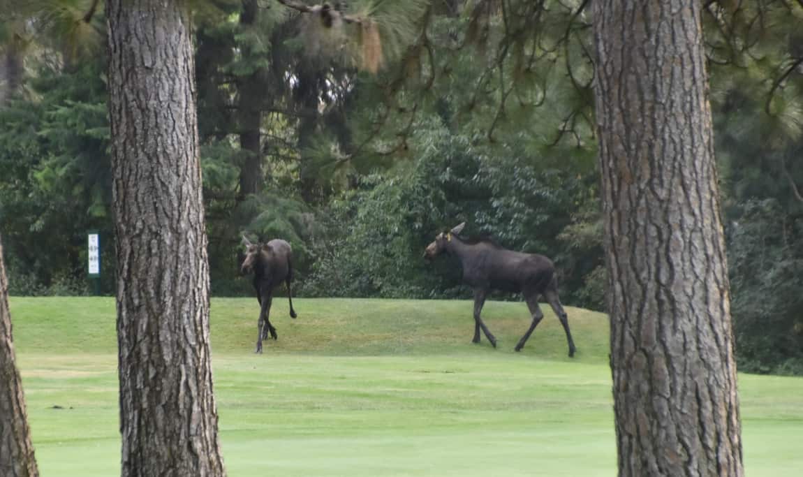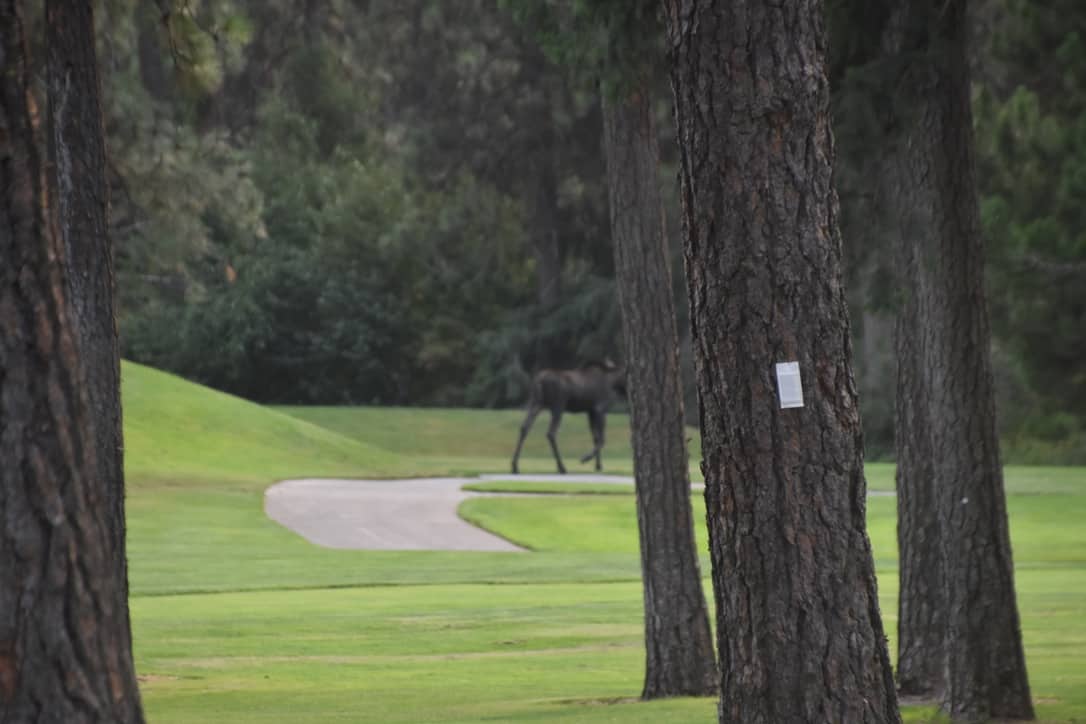 A few minutes later we saw two more moose trotting down the adjacent fairway. They looked like juvenile males and were beautiful…See golf and the land together is what it is all about. On our first trip in an RV to Alaska: there was a rule, if you did not have a picture you did not see it, so Janice tries to get pictures of any animal, anytime!