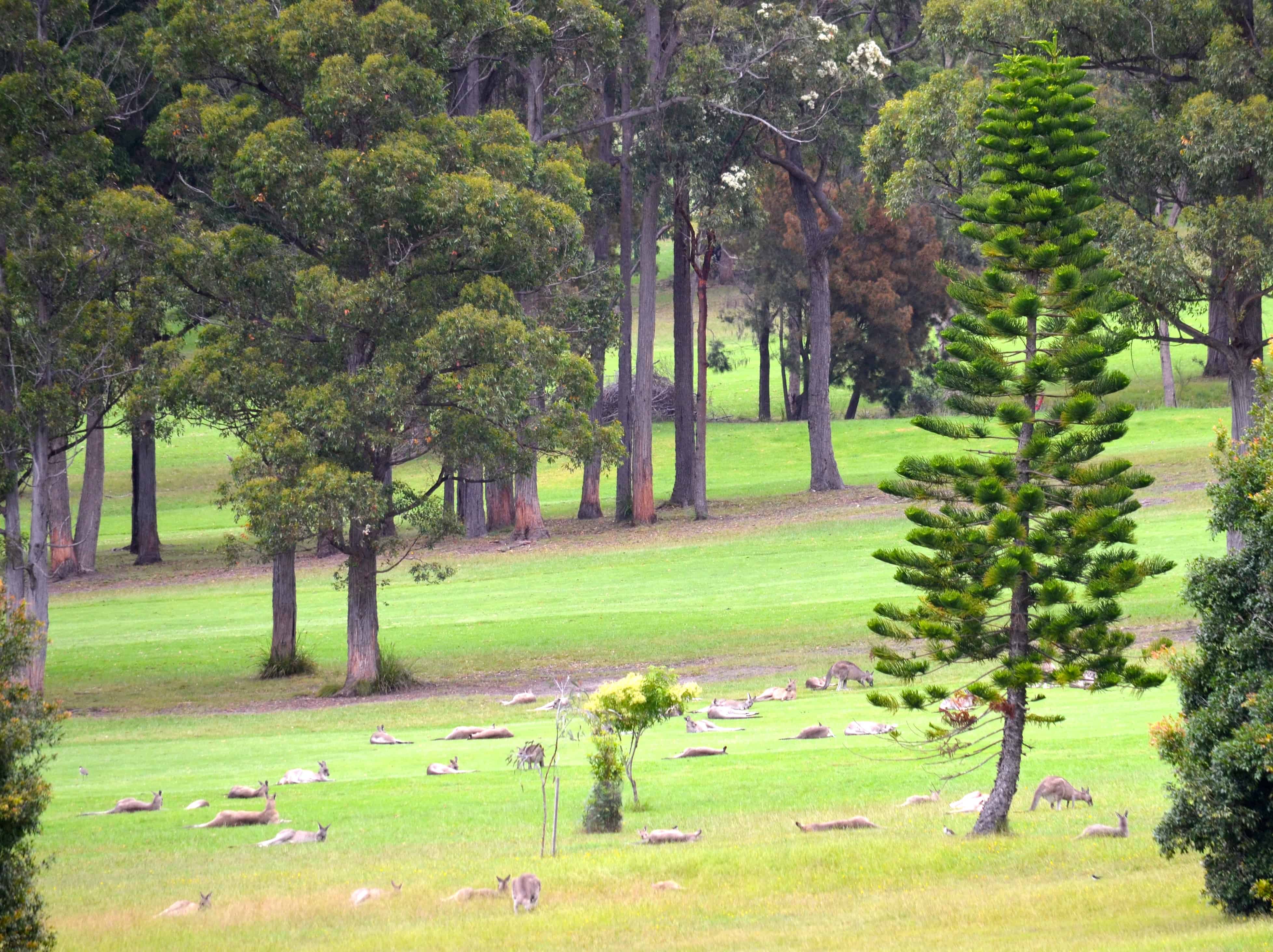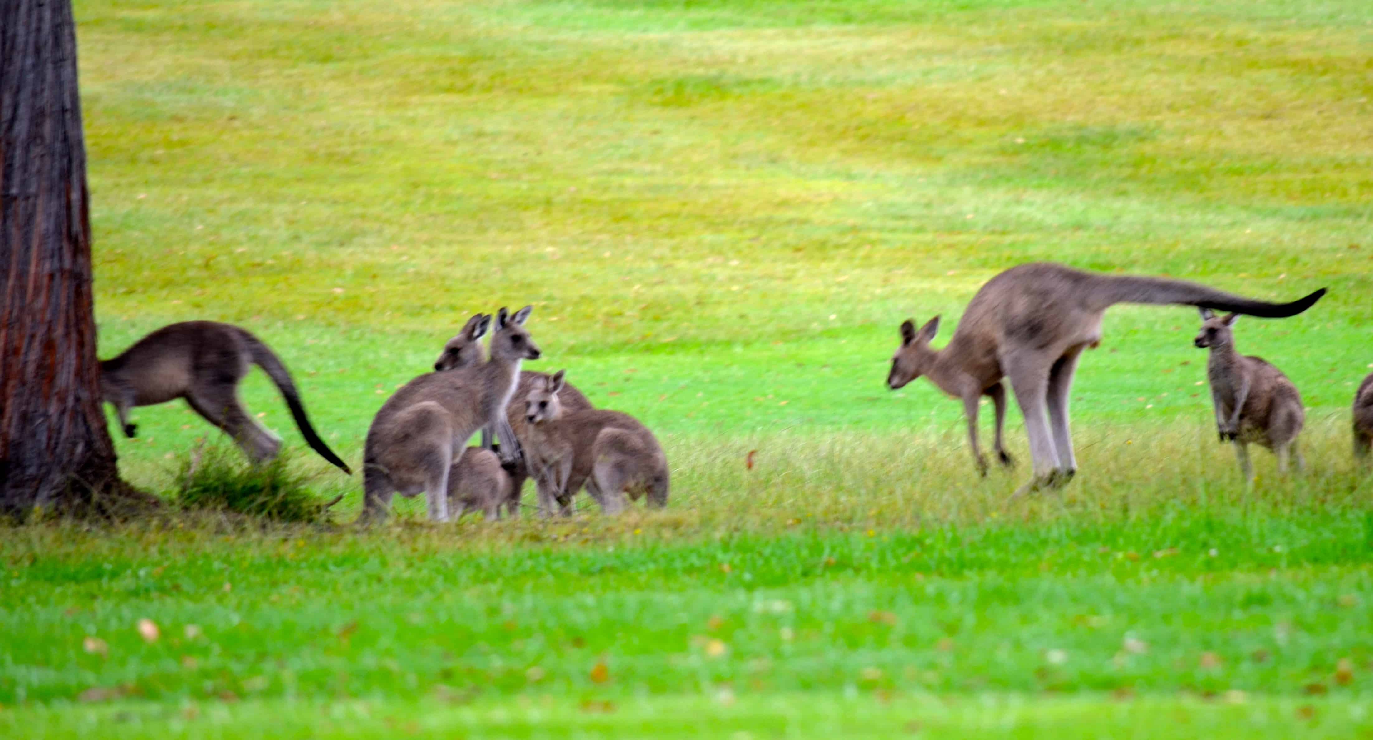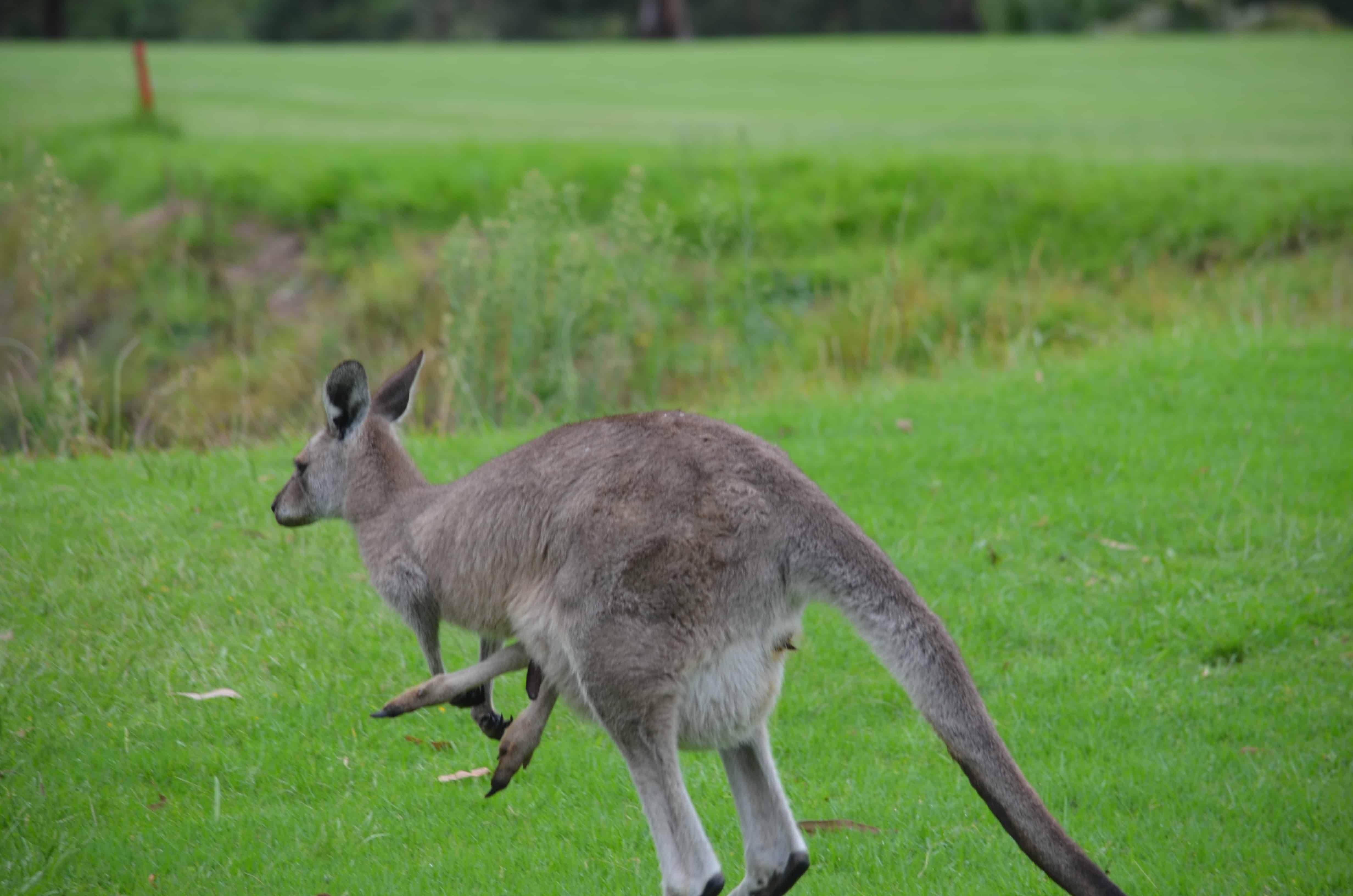 The next morning we drove across the street to the Eden Golf Club for our 8:30 tee time. In the pro shop the pro told us they did have Kangaroos and they were friendlier than the ones at Anglesea and off we went. Not long after starting we began to see tens of kangaroos laying down on the fairways and others feeding on the grass. Amazing, we saw a female with the Joey sleeping in the pouch (lead picture), head dangling. We continued to play, the course was in fantastic condition and a excellent test of golf. We passed another mom kangaroo and the Joe’s feet were hanging out of the pouch guess he was feeding. What a day was had by all! Enjoy Eden Golf Club.