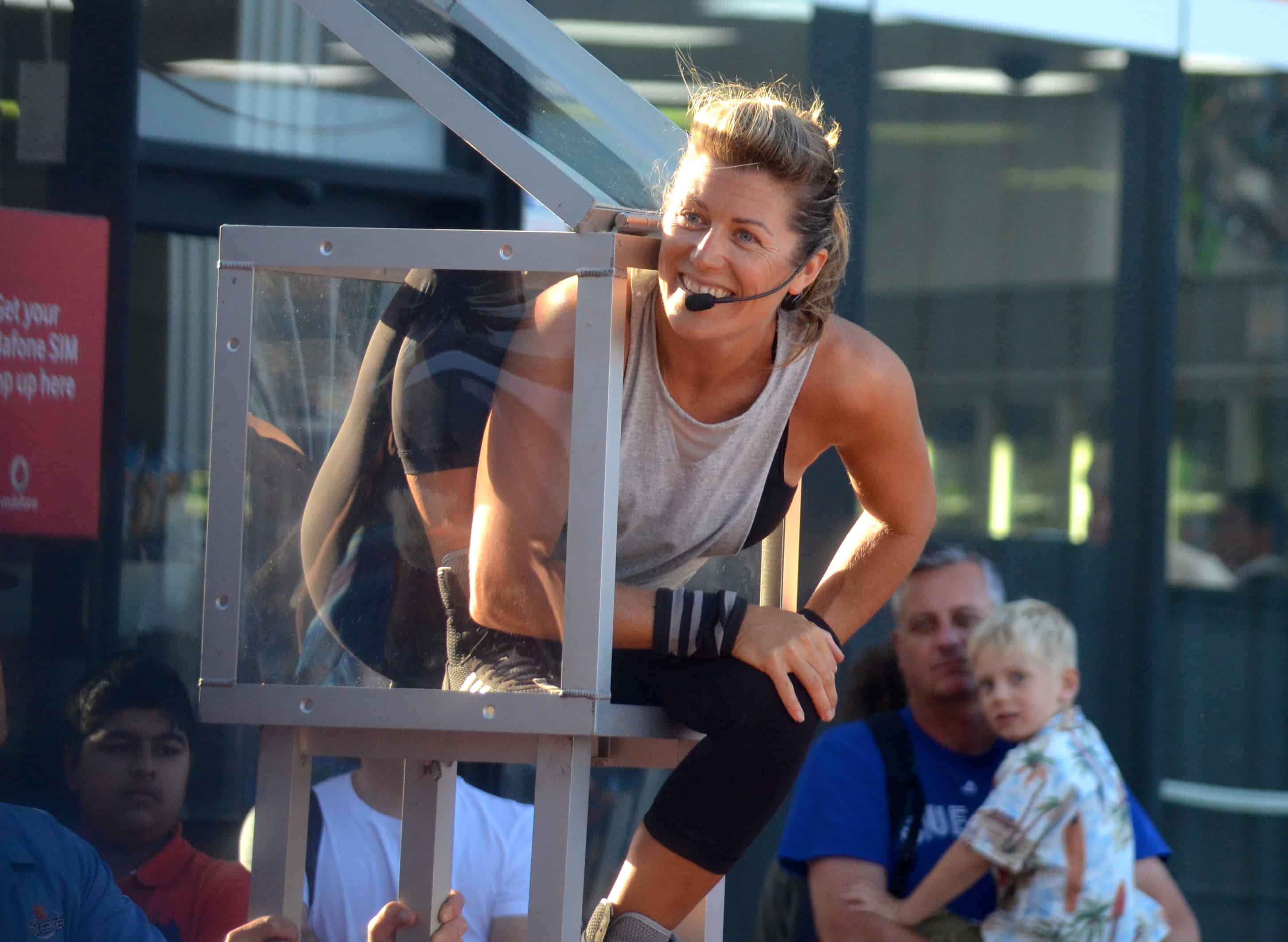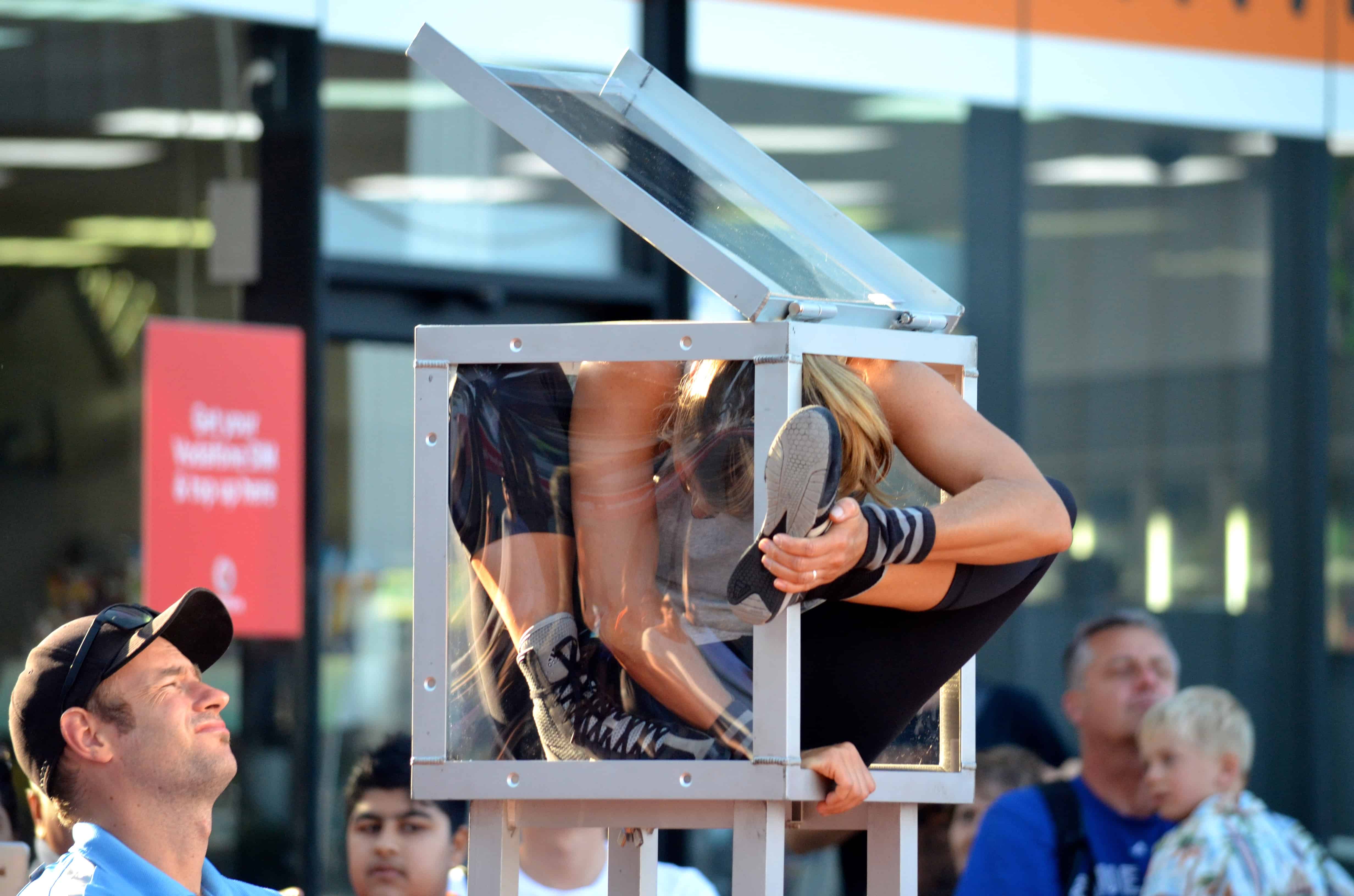 Auckland was celebrating it’s 175th birthday and the weekend was to be full of street fairs. Getting off the ferry we found an English contortionists squeezing into a glass box.