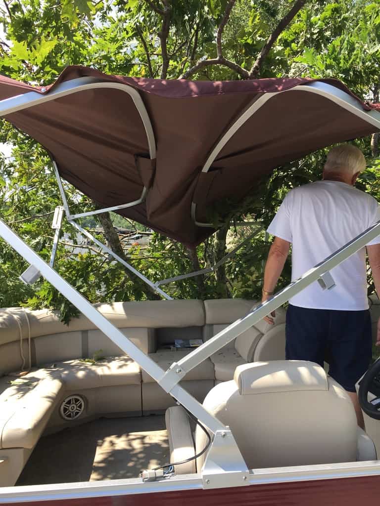 After golf Brian had rented a pontoon boat. We were packing the beverages and food getting ready to head out, Marilyn and Steve we in the boat waiting for the rest of us.. .when… all of a sudden she heard a loud crash and people screaming something about Marilyn and Steve. We all ran to the back and saw that a large Oak tree near the water had fallen and it was on top of the boat the canopy crushed and thankfully Marilyn and Steve were fine. holy cow!