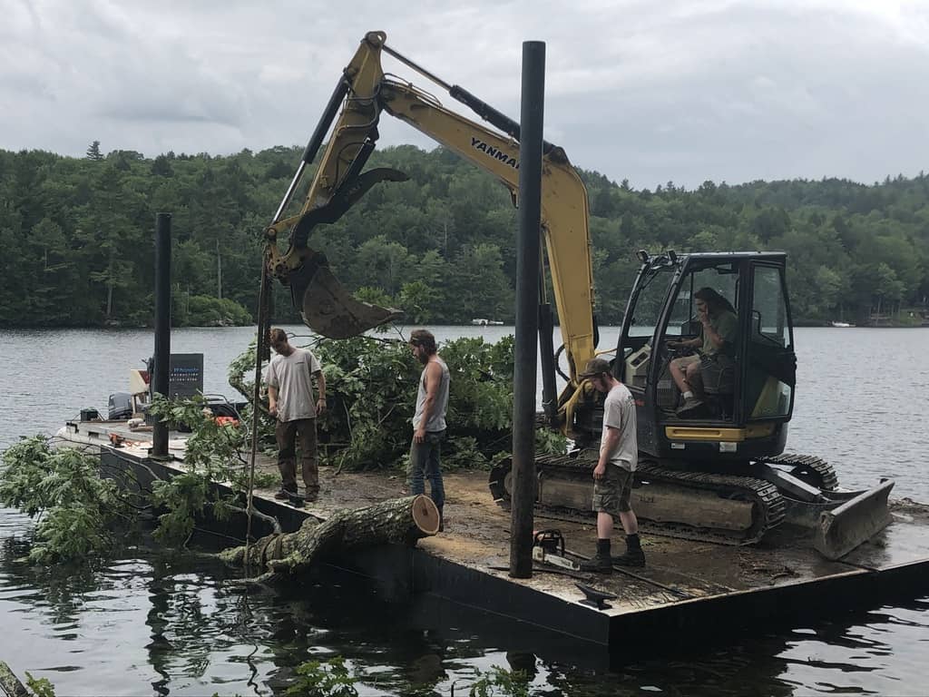 Monday morning the cleanup crew came to remove the tree. The fun part was watching one of the workers cutting off branches while in a crain bucket and then be lifted back on the barge where he jumps out. This video is fun!