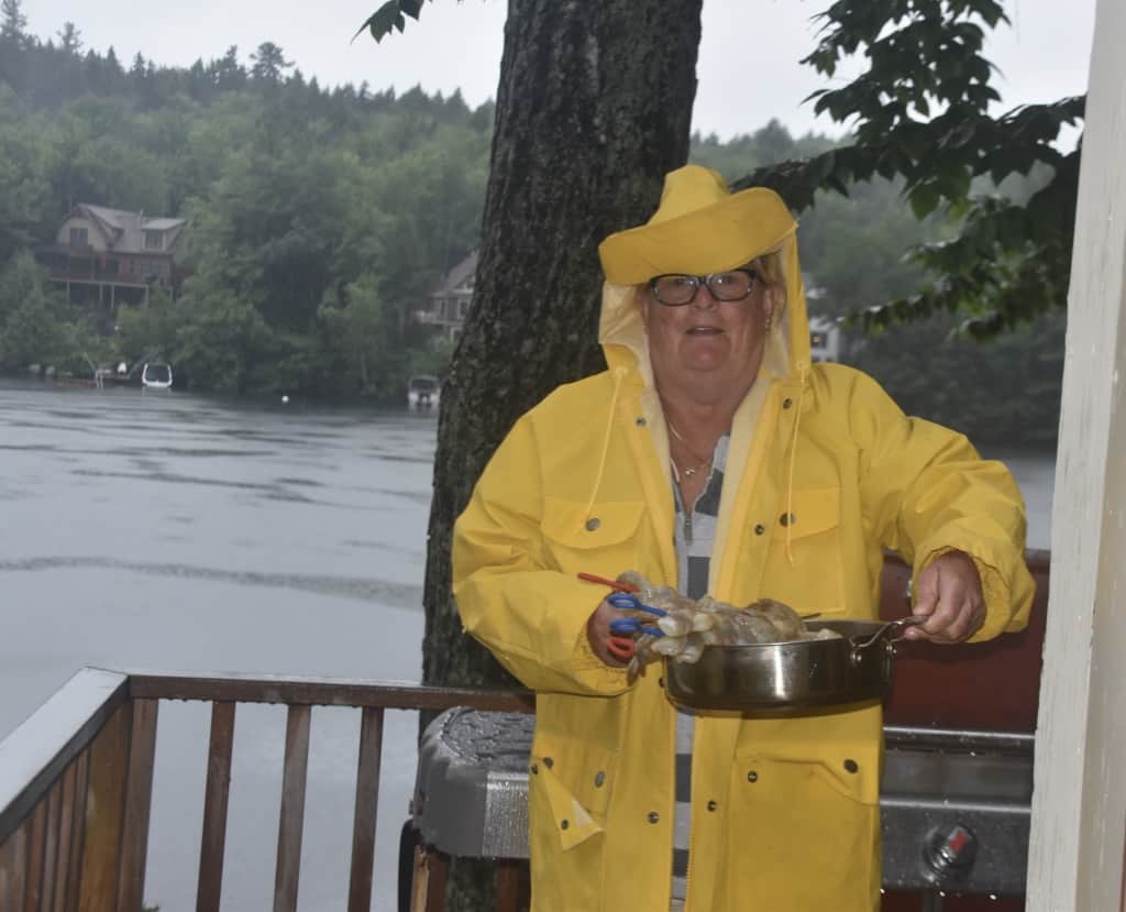 Back to the boat and the wet trip back to the house. Of course BBQ shrimp was the menu item fore thew evening and fortunately, Connie had a large yellow raincoat to wear out at the grill.