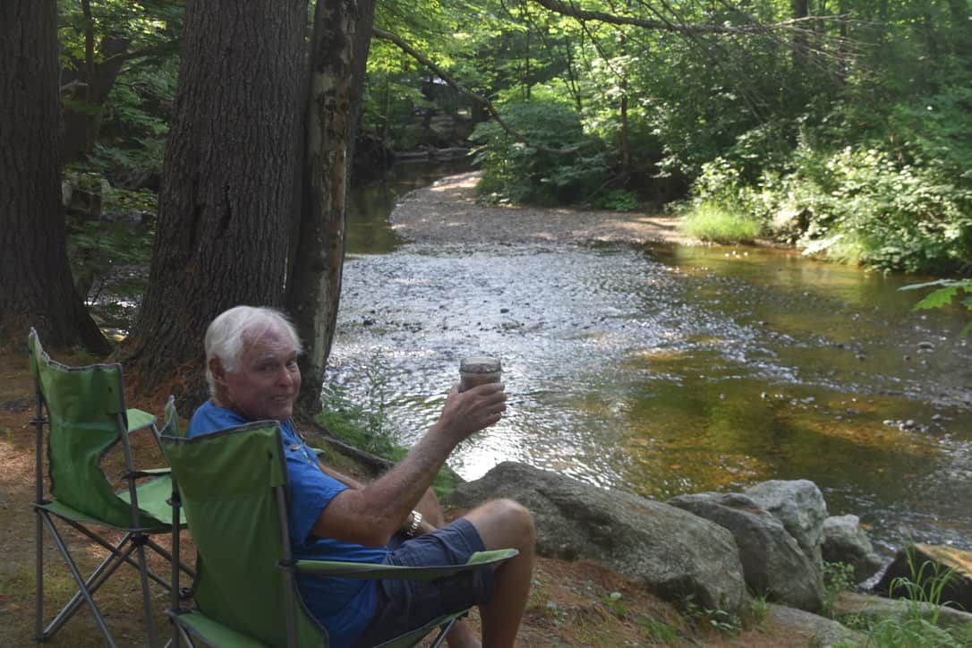We went to the site and backed in.We were on the edge of a wide stream with the water flowing over a small dam, it was just beautiful.We fixed a drink, got our chairs out and enjoyed the serenity of the place.We met the couple next to us, we seem to do that a lot!They were from New Hampshire and told us that this was their favorite campground in the state.They book space 44 several months in advance because it has a wonderful grass area on the stream.If ever back in the area we will request that site!