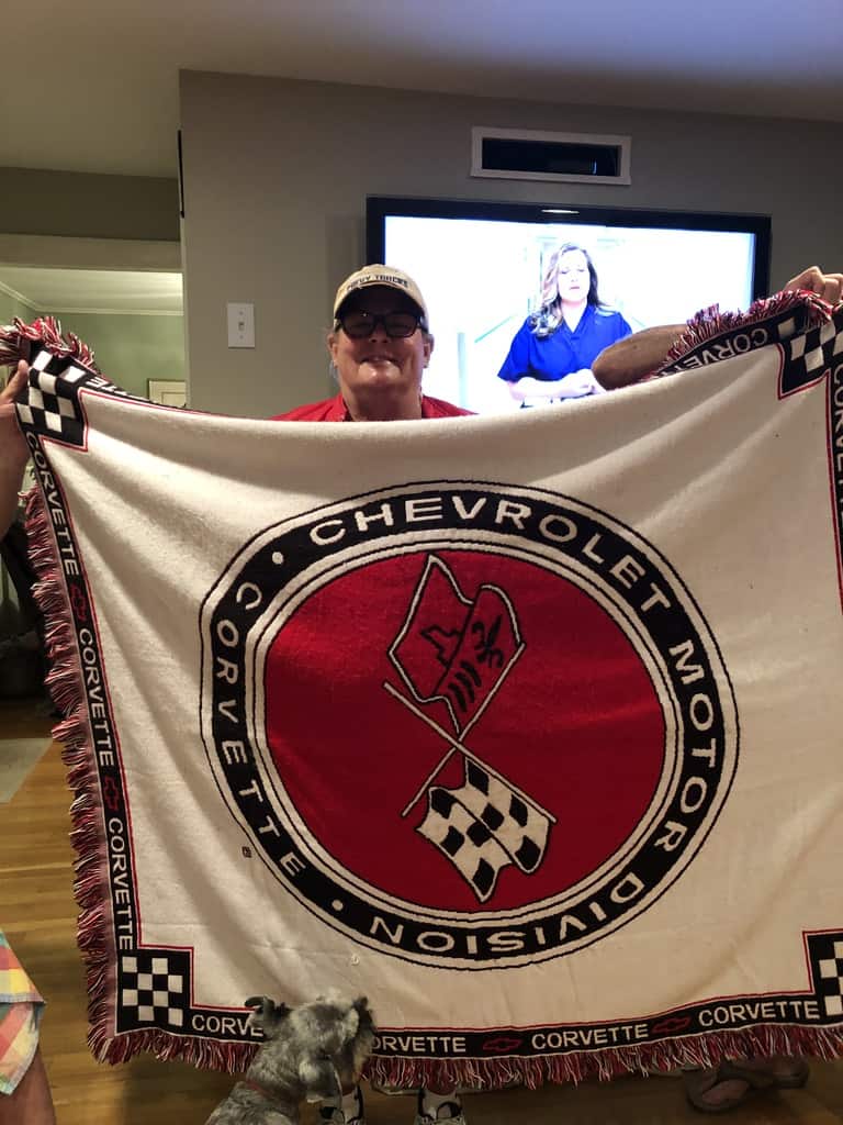 Connie and Janice started reminiscing about the time Janice bought a new Malcolm Konnor Commemorative Corvette in 1986 and could bring a guest to pick it up at the plant in Kentucky. Malcolm Konner Commemorative Edition Corvettes were built in honor of Malcolm Konner, founder of Malcolm Konner Chevrolet of Paramus, New Jersey. Konner’s flew us all down in an old DC 3. It was loud and we landed on a dirt strip not far from the plant. The next day we toured the plant and drove corvettes on the test track. The handed over the keys to our brand new cars! All 50 of us drove together back to Paramus. Some towns along the way had parades for us…what a memory. Connie still has the jacket and blanket each of us got for the trip!