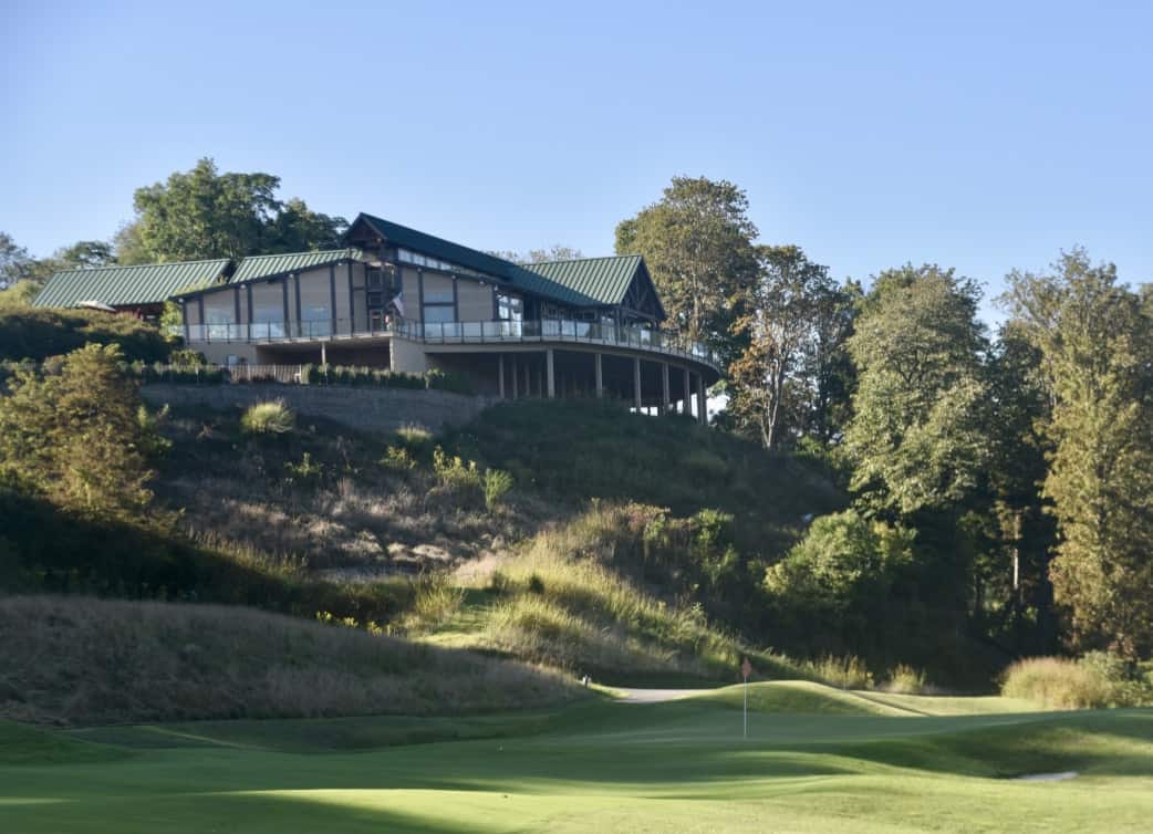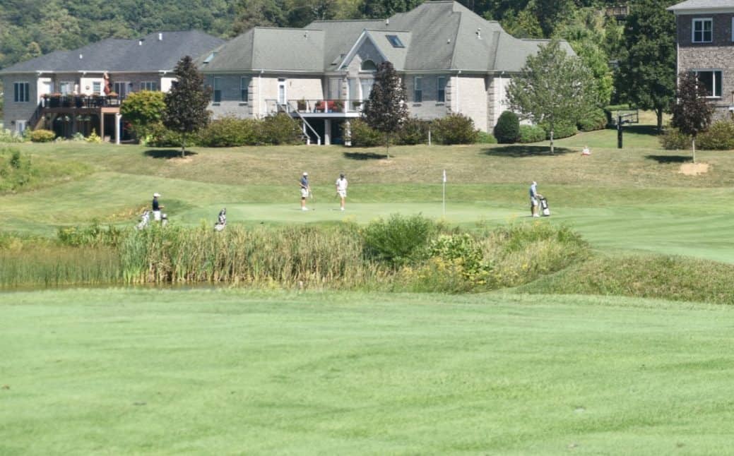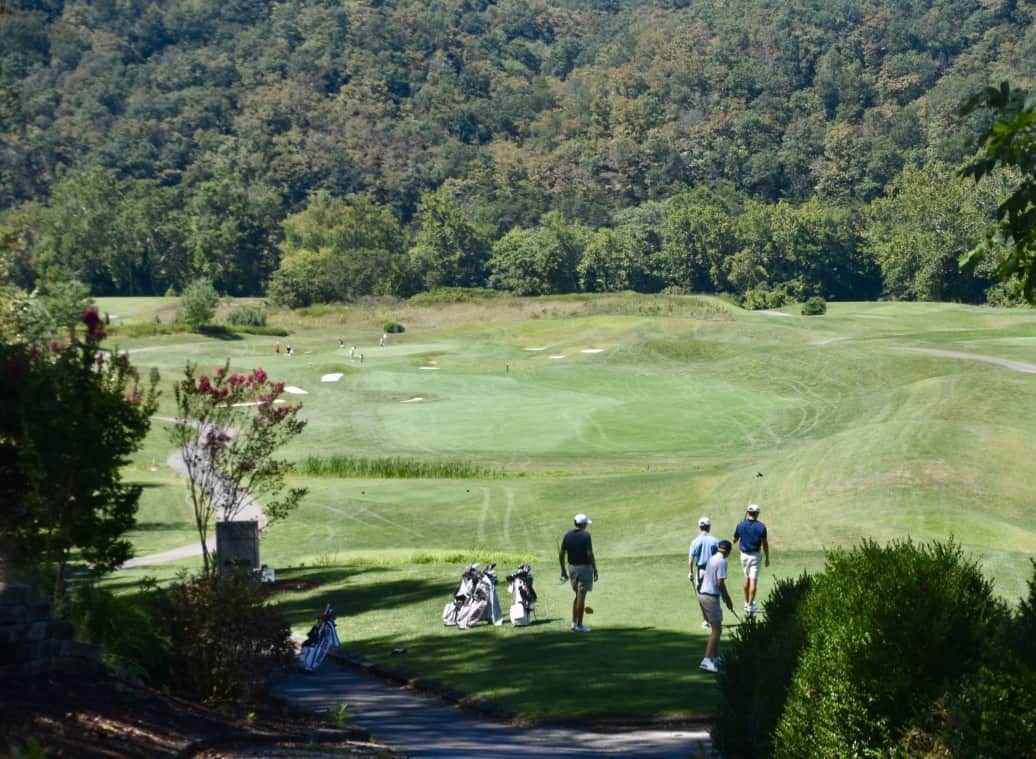 There were a number of young college golfers from both Virginia Tech and Radford University playing ahead of us. It was their day off but since the weather was so wonderful they decided to play. Those kids could hit the ball! As we played one thing you could tell for sure that Pete Dye had his hand in the course. Small pot bunkers, if you were long and the green was by the river there was always a small bunker to save the ball from it’s watery grave, but not a simple save! Unlike many of his courses, the greens were very small and relatively flat, we learned later the story behind this. Even when you had a relatively short shot into a green it was very difficult to stay on the small surface.