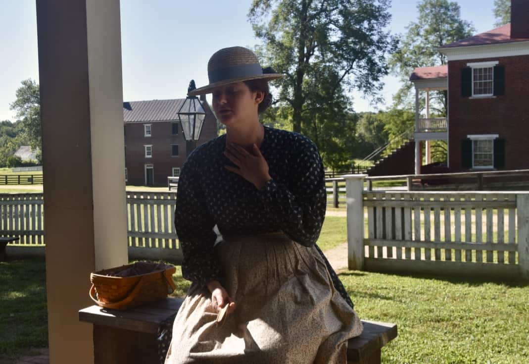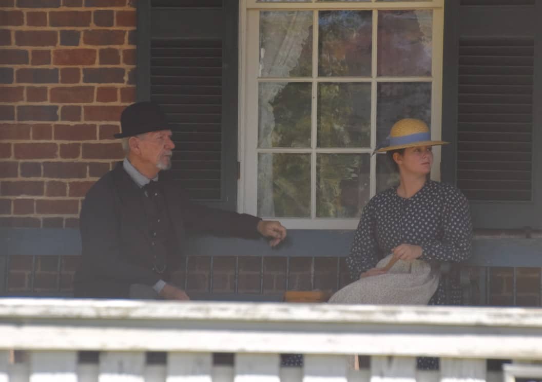 We were taken, by the ranger to the Clover Hill Tavern and we were introduced as travelers from the train station here to meet the people and town and hear stories of the past weeks. The person on the porch was Emma Hix, the daughter of Wilson Hix the owner of the tavern. We sat on the porch of the tavern and asked questions and she told us the stories of the past month. The fighting was going on by the train station and she and her family had hidden